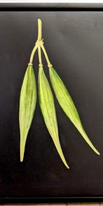 After witnessing the birth of two grandchildren in a single year, I have turned my attention to some of the smallest, most overlooked, most fecund saviors of the planet--the Milkweed seed--scarcely as large as a dime and as thin as a pencil point. Depicting these tiny activists softly ensconced in their pods has taught me the interconnectivity of human birth, plant husbandry, and entomology. The colors in this painting refer to those seen in Flemish portraiture, and the milkweed floss alludes to the white lace ruffs worn in the 16th century by the portrait subjects.